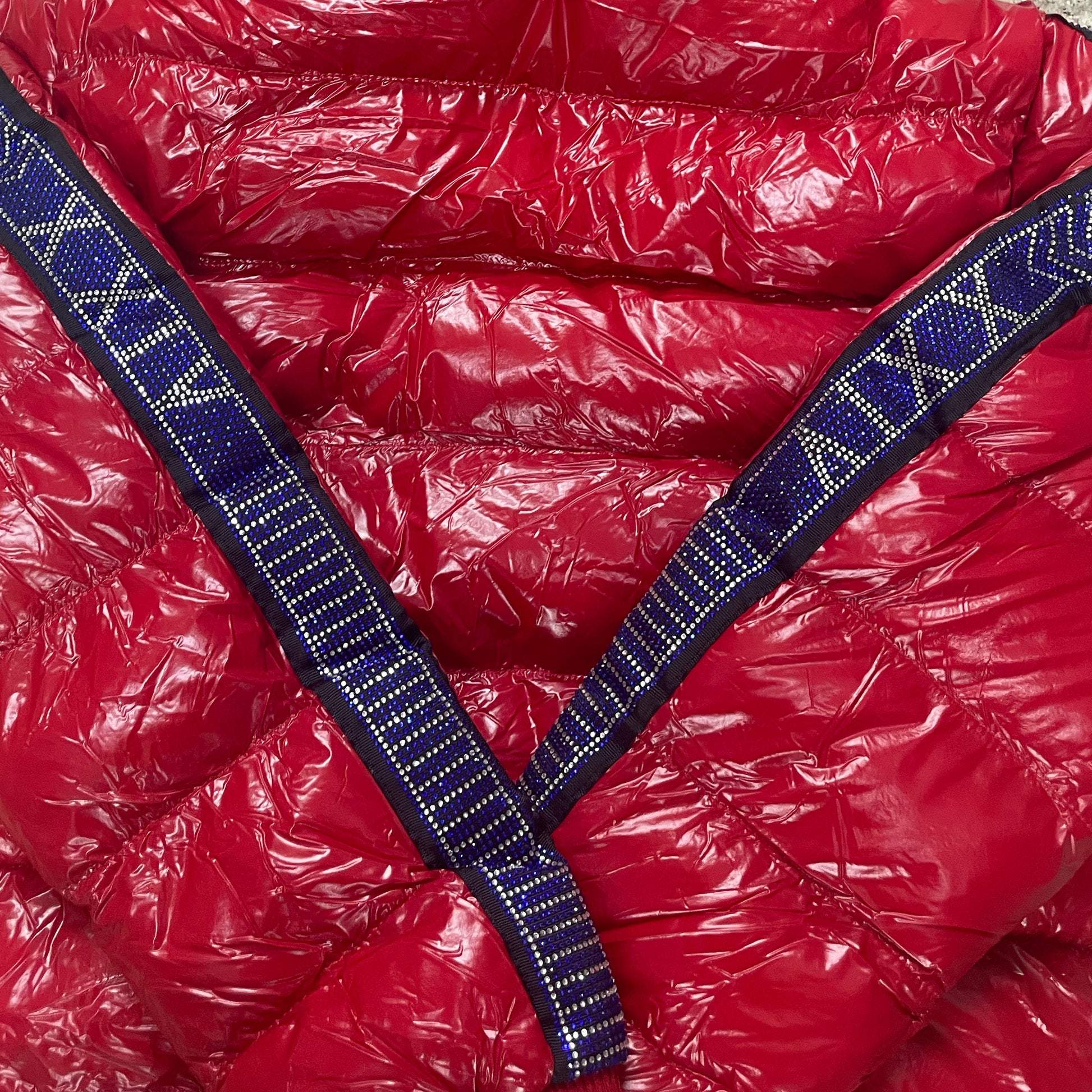Red Puffer jacket featuring eye-catching blue crystal detailing on the sleeves for a standout look. This unisex style includes a removable fur-lined hood and comes in a sleek black finish with a shiny puffer construction. Perfect for staying warm while making a statement. Note: This jacket runs small, so we recommend sizing up for the best fit.